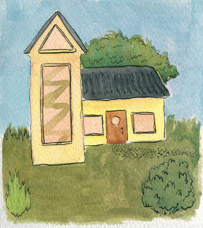 Original painting, a home for watching the ships come in, with a bold stained glass detail leading up to the lookout. This property has a great view of the sea, while being far enough back from the beach it might even outlast erosion for a full human lifetime.