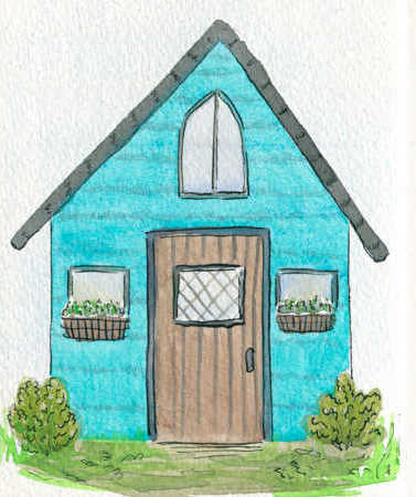 This original painting depicts a small crisis shelter, in the style of those built by guerilla aid groups, but given the finishing details it might need to blend into an urban setting. This tiny home will keep you out of the wind and weather, but probably best suited for a minimalist.
